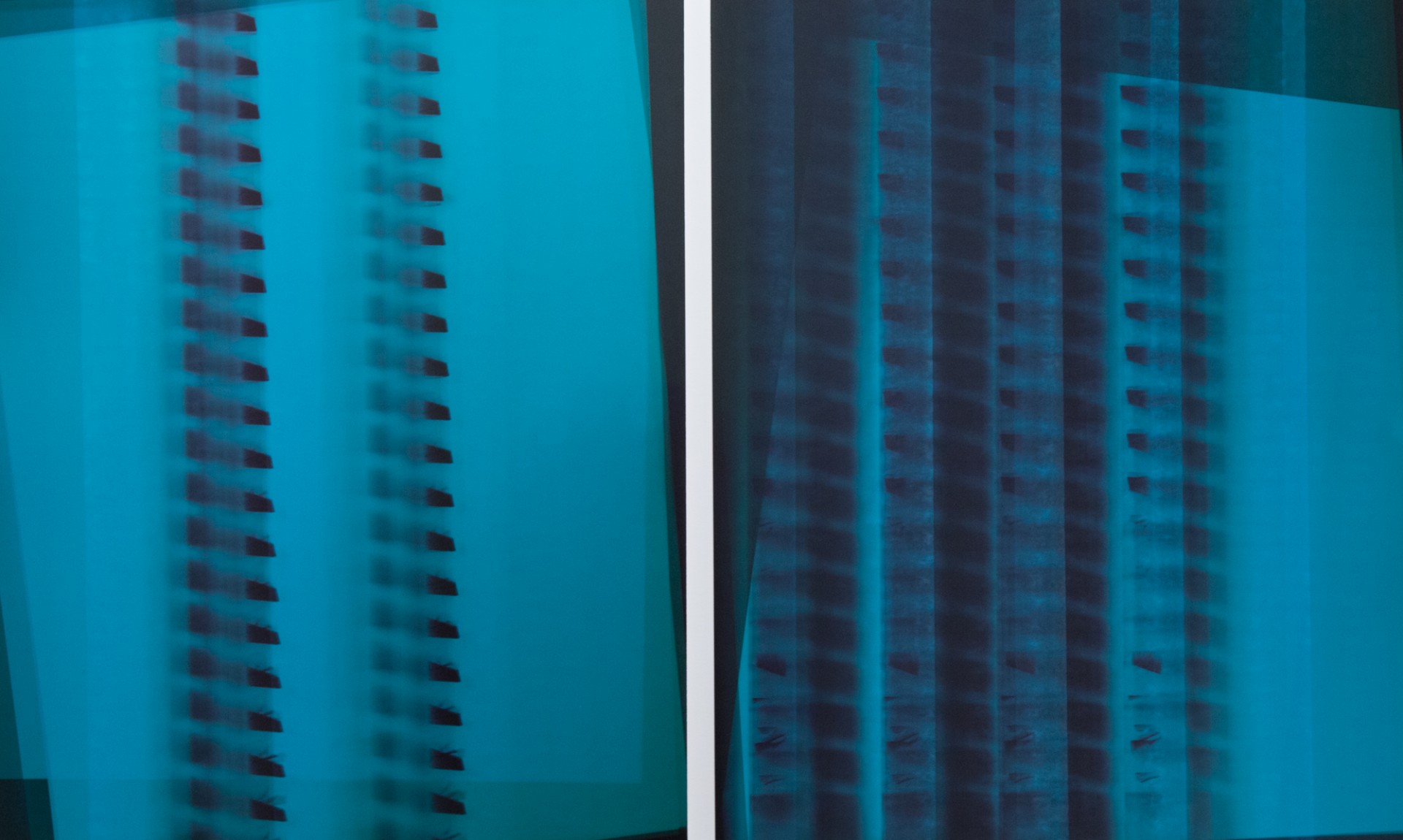 Janie Julien-Fort thus abandons the notions of instantaneity and immediateness central to the proliferation of contemporary digital imagery and virtual support media, for patience and observation, two traits that are at the heart of Faire rouler la machine (Kreonite) [keep the machine rolling (Kreonite)]. This body of works consists of a series of photograms produced with a film processor—a machine that automates photographic development. In it the artist interfered with the normal development process by opening the machine to expose the paper to daylight. The resulting images bear signs of the mechanism: variations in light, temperature and traces of the machine’s rollers and gears.